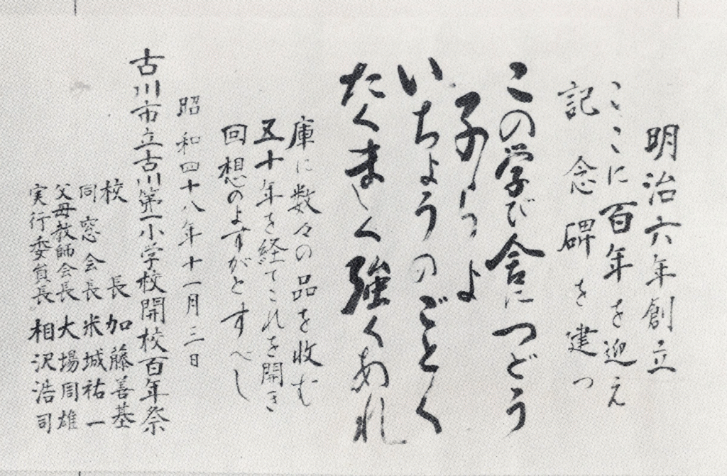 古川第一小学校では1973年に開校100周年を記念し、校庭に建立された記念碑の下にタイムカプセルを埋めました。記念碑には、「庫に数々の品を収む五十年を経てこれを開き回想のよすがとすべし」と刻まれています。